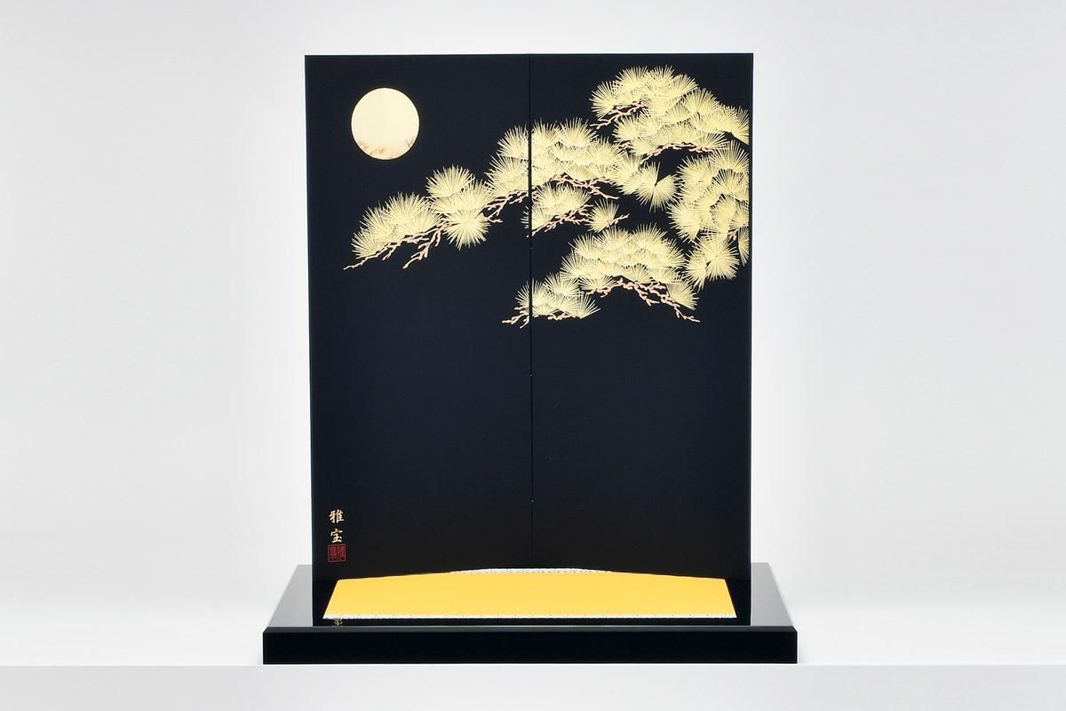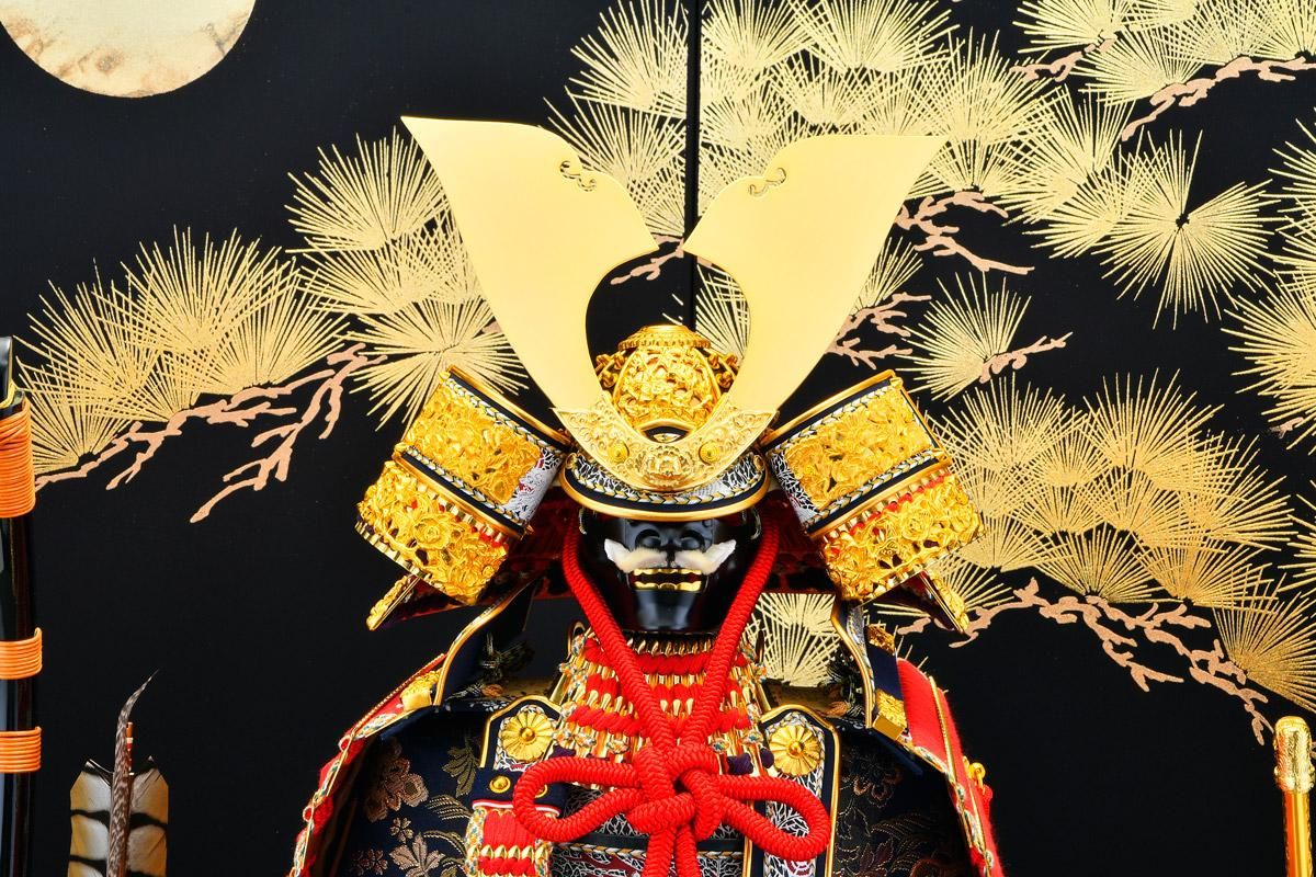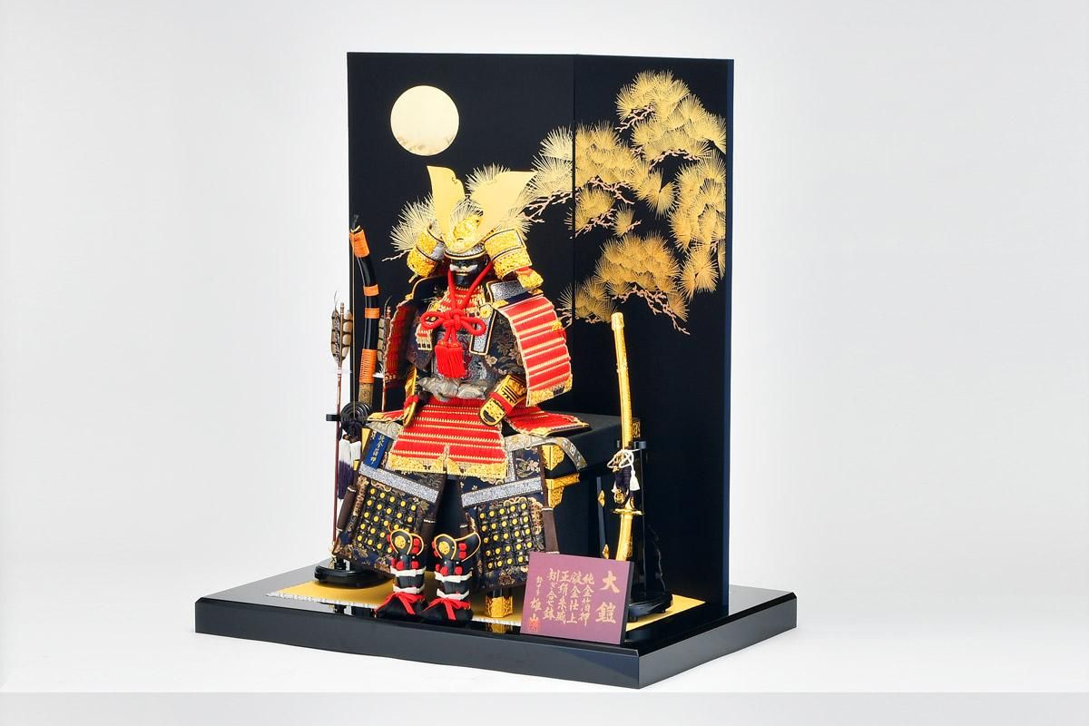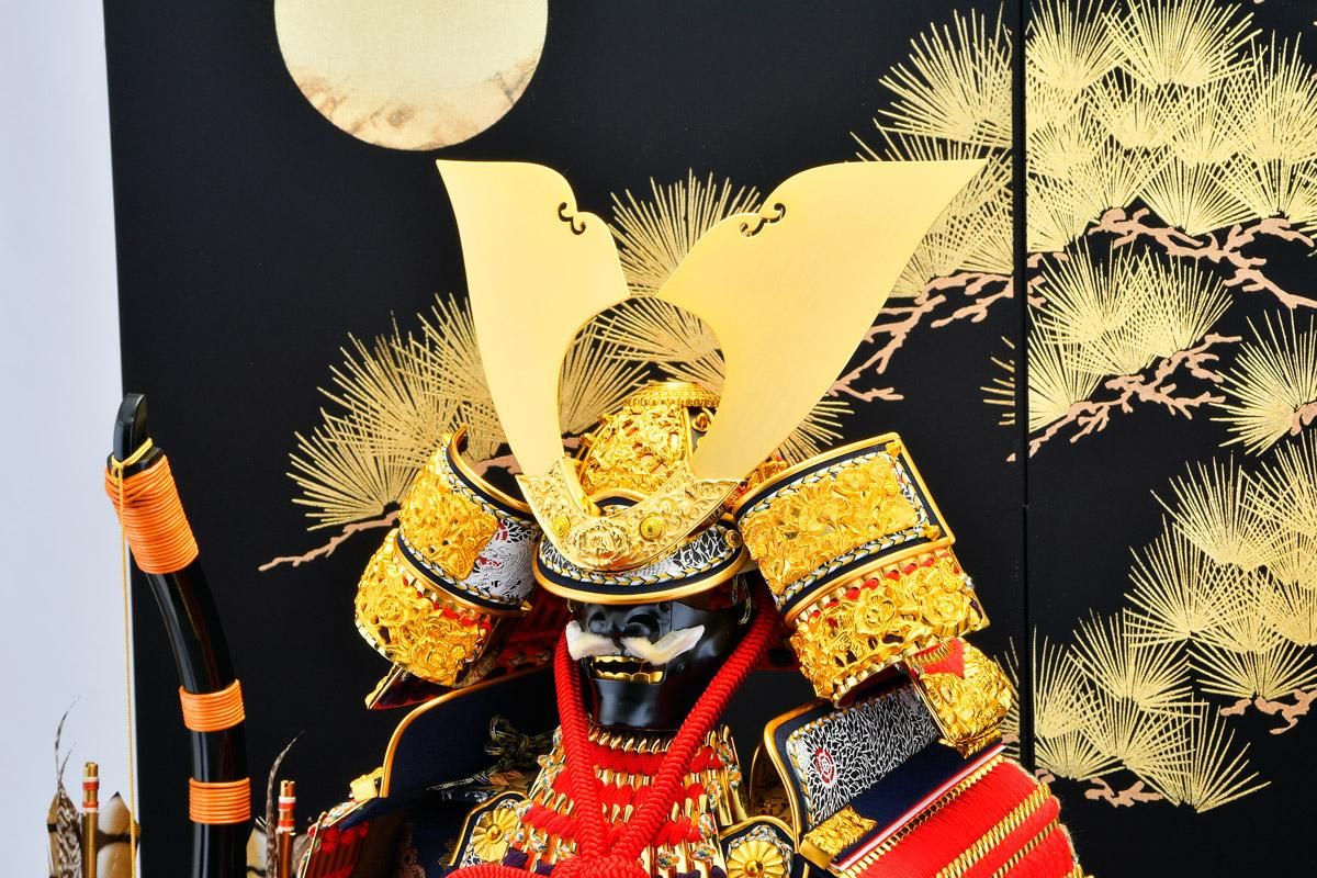 弦走の絵韋に不動明王が描かれた、本金箔押の重厚感ある鎧です。松と月を表現した黒シルク屏風も人気が高く、赤糸の鎧とよく合います。(高級フェルト敷布付)