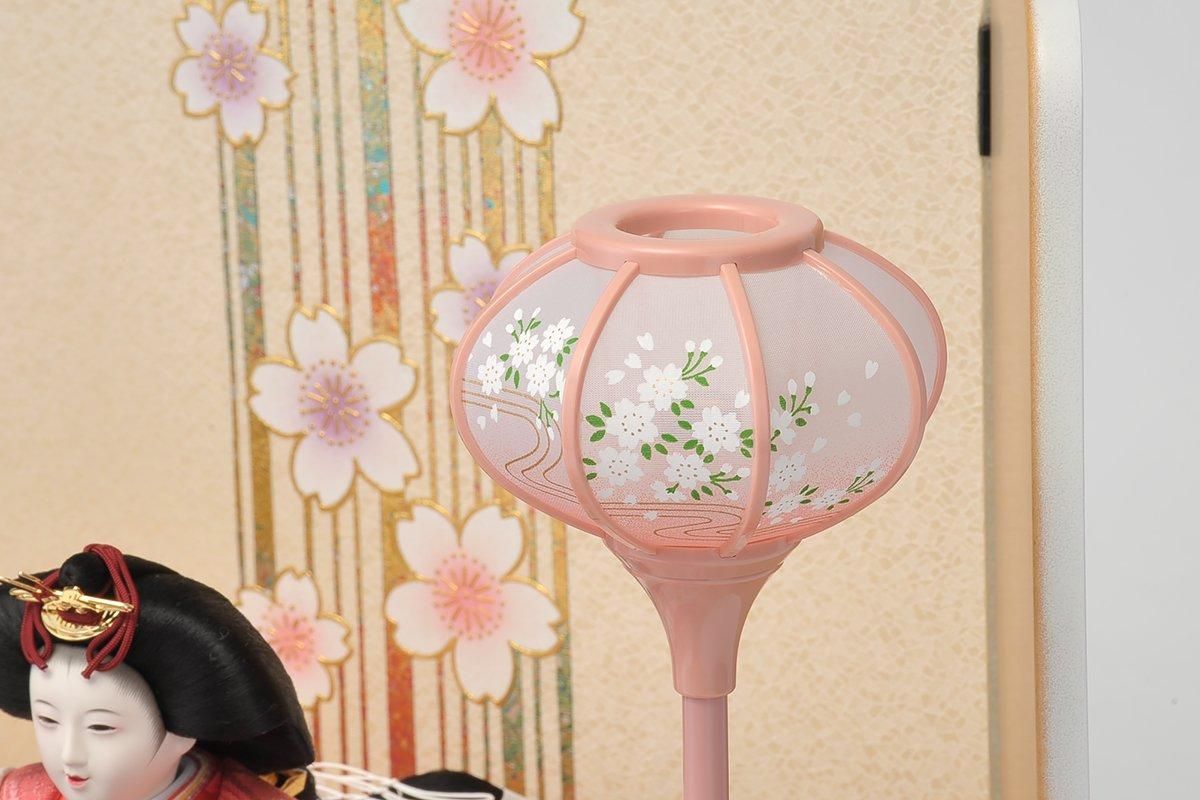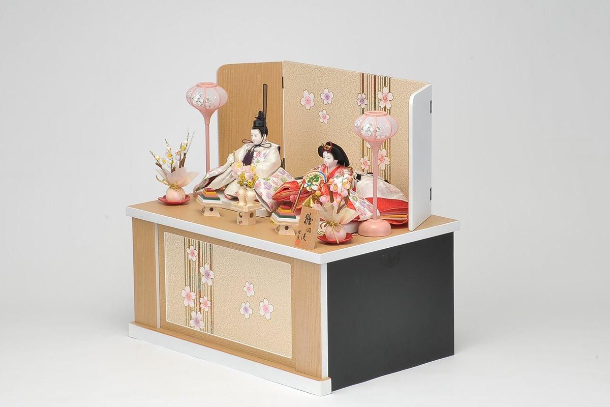 木目と白を基調とした屏風と収納飾り台には金彩加工のかわいらしい桜が散りばめられています。