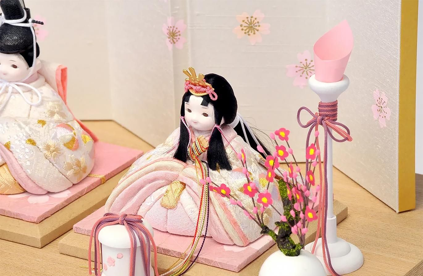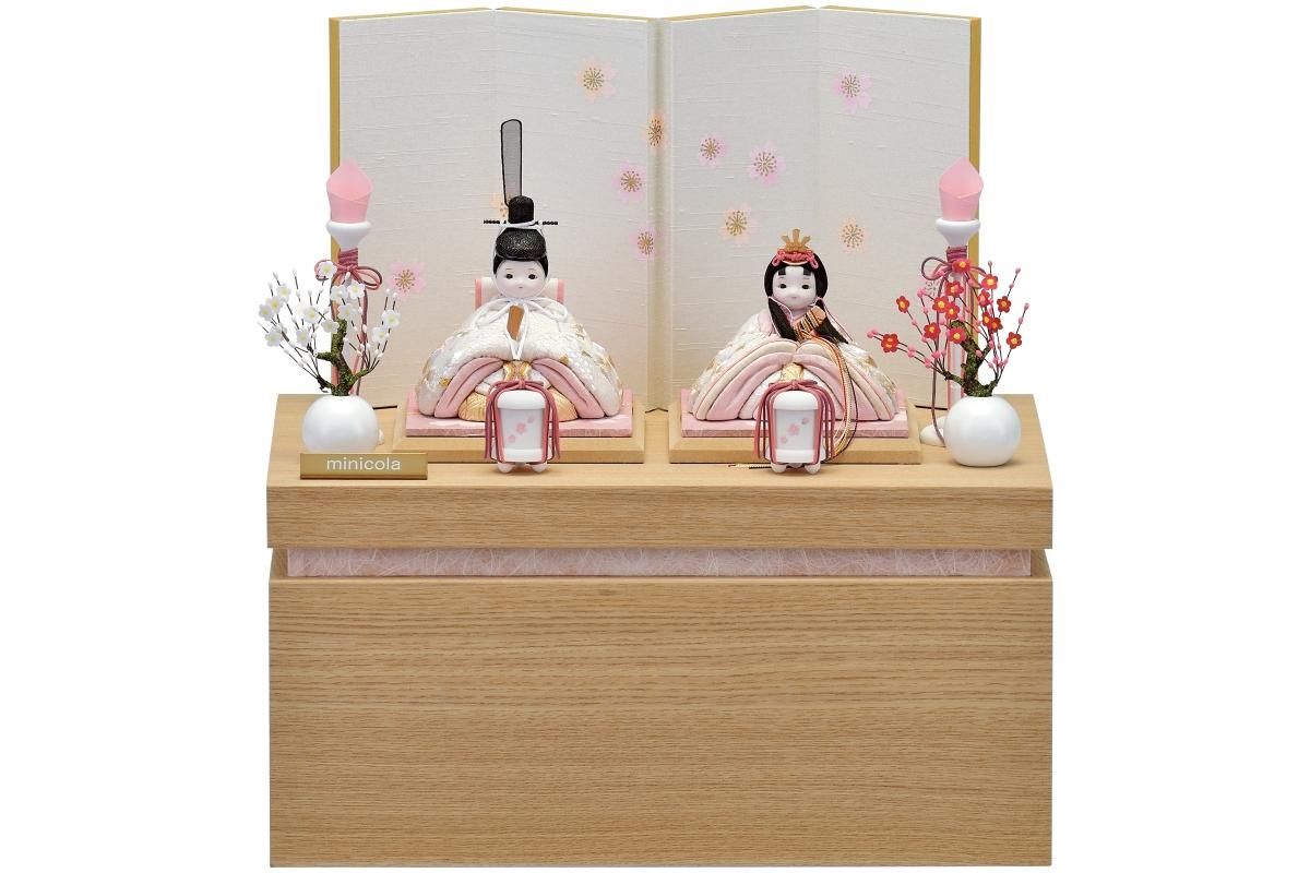 桜と鞠の模様が刺繍された淡く優しい色あいのお着物を着たお雛様です。 31cmと超コンパクトでどこにでも飾れるようなサイズがうれしいですね! 収納箱が付いていますのでひとつの箱に片付けられてとっても便利です。