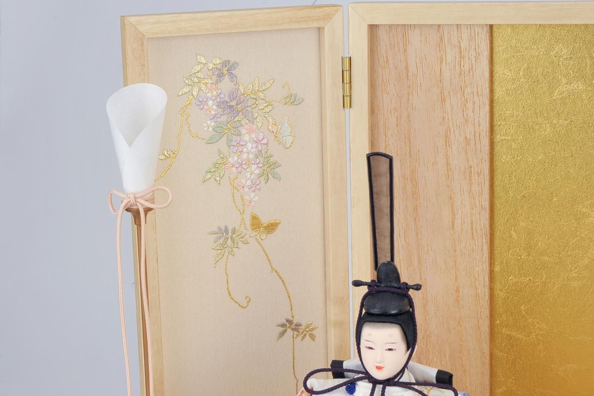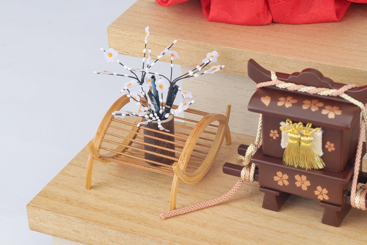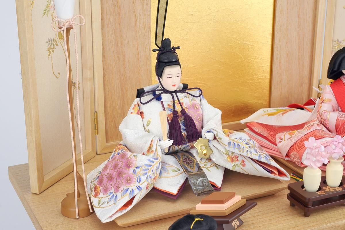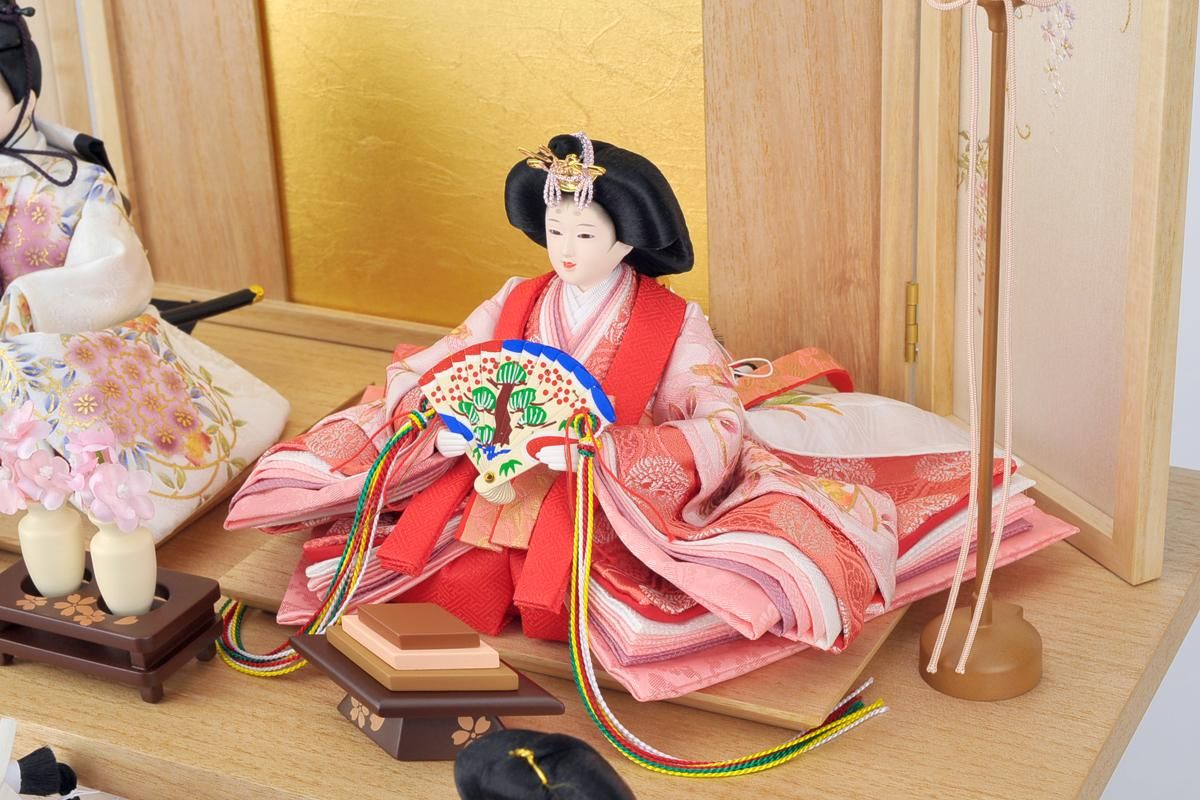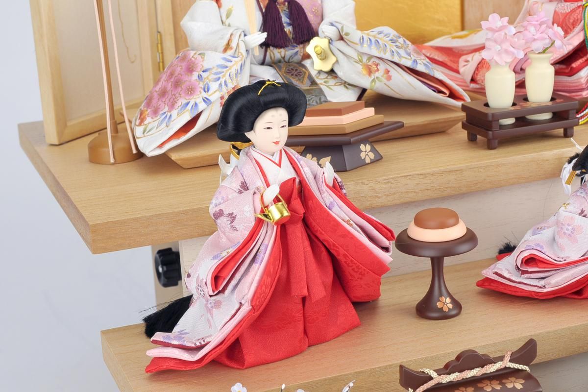 木目を活かしたケヤキ調の新作三段飾りがデビューしました。 平安豊久厳選の伝統的な衣裳は魅力的です。 幅60cmのコンパクトサイズに加え段の立ち上がりを低くしてスタイリッシュで圧迫感の無い装いになりました。