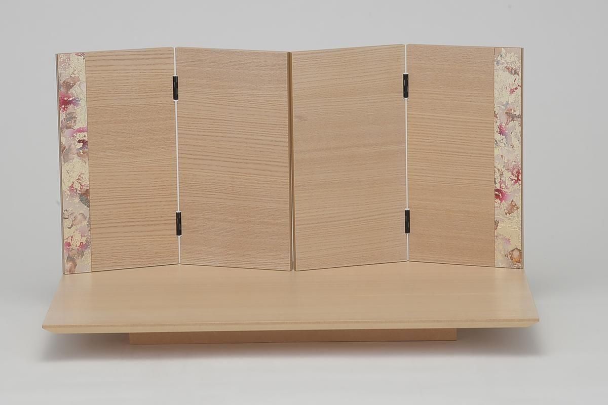 お印伝とは鹿革をなめして染色し、漆で模様を描いた伝統的な革工芸品です。 その名の由来はインドから伝わったためと言われています。 落ち着いたトーンの衣裳に合わせて屏風・飾り台・油灯・お道具など木目調に統一したおしゃれなセットです。