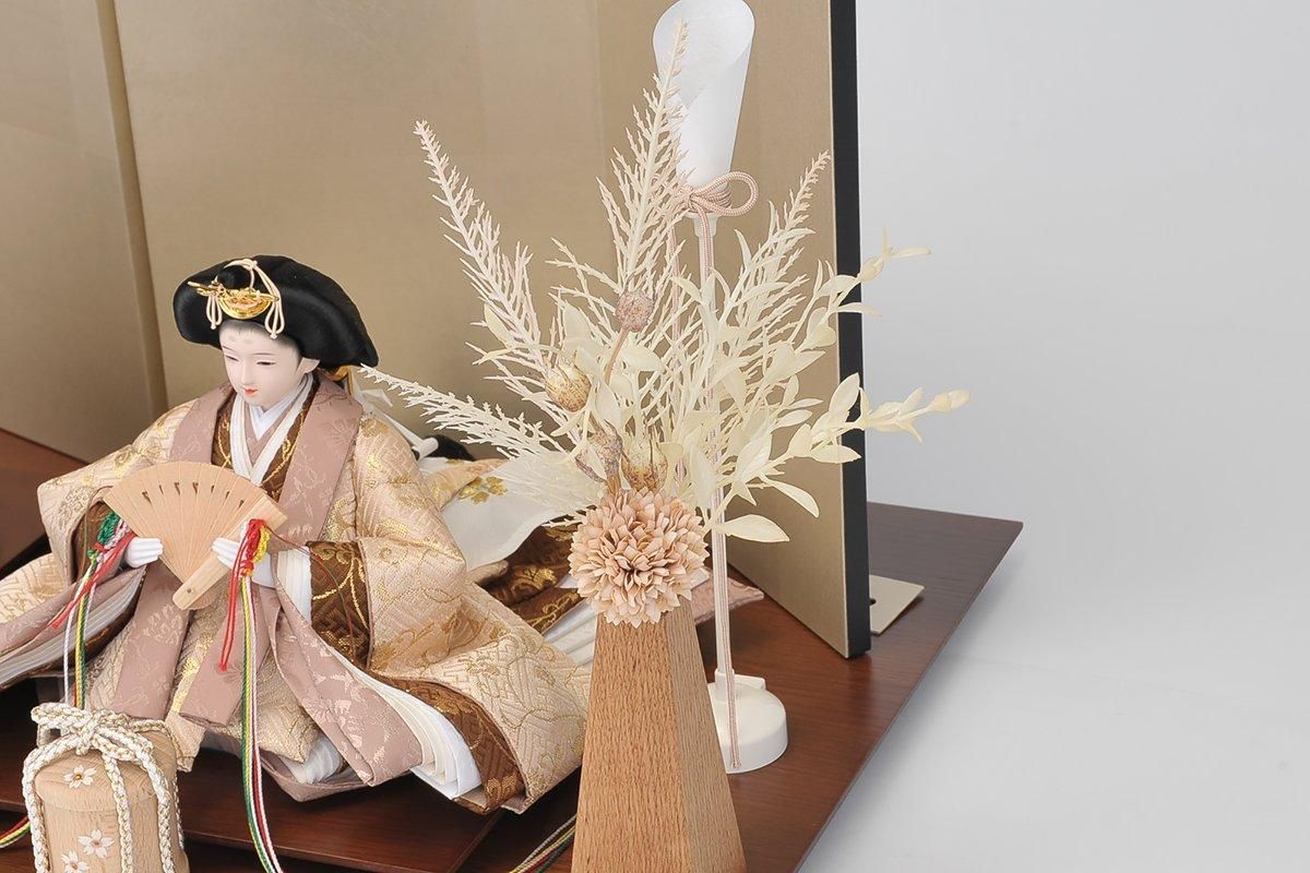 落ち着いた色合いのこの屏風は古美を表現するために古風な高級装飾紙を使用し仕上げた古代絹張り屏風です。 唐草模様の衣裳は気品漂う装いで屏風や飾り台との相性もピッタリです。 モダンなフラワーアレンジメントがおしゃれで人気です。