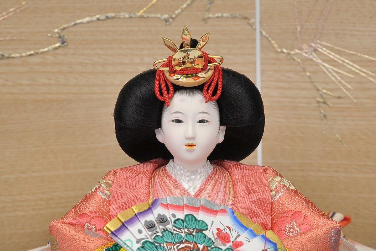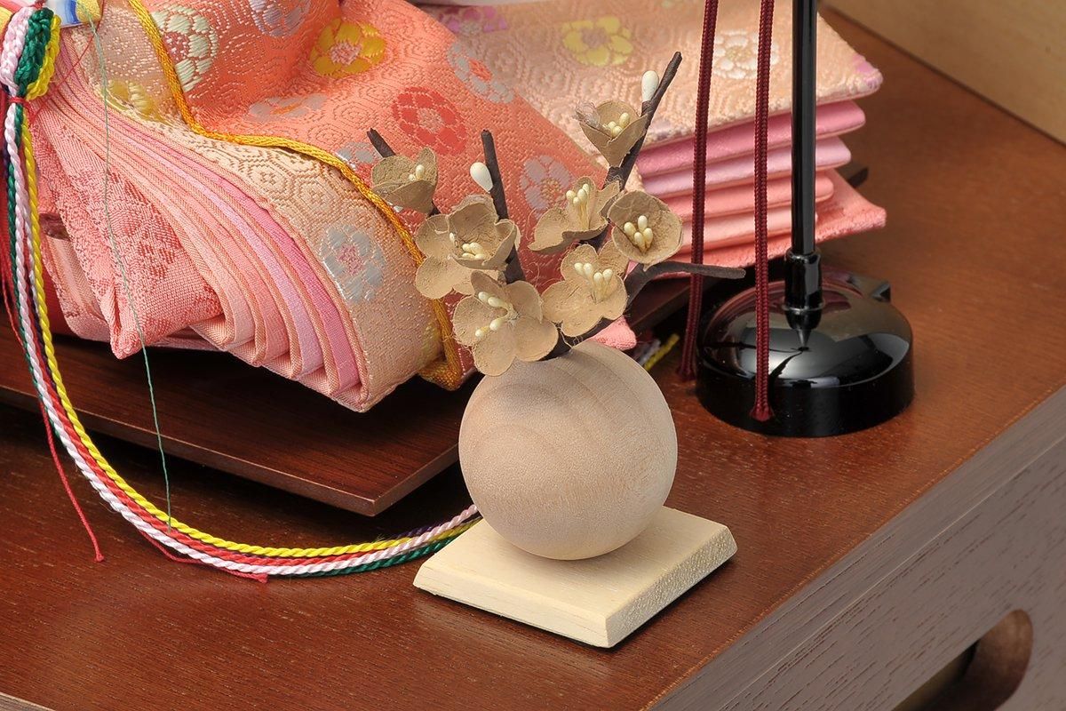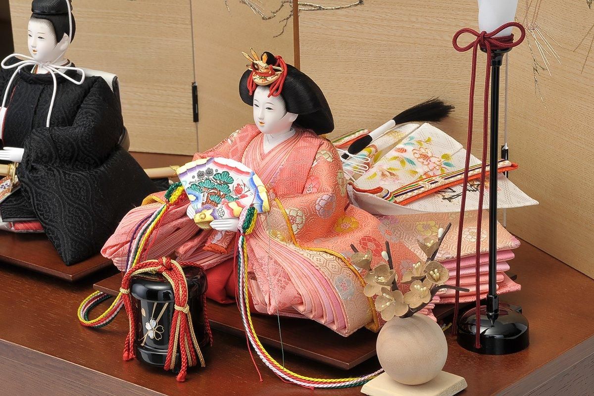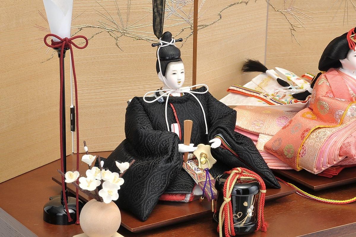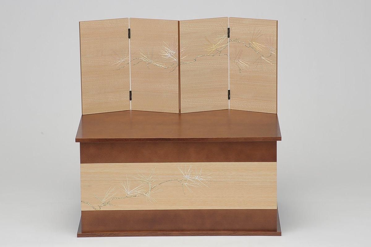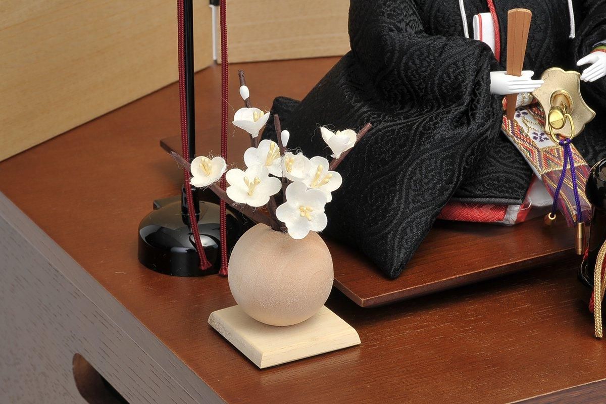 木目を活かした屏風と収納飾り台には上品な松葉が描かれ、前飾りの貝桶には螺鈿細工が施されています。 両サイドに置かれたアイボリーとベージュの花飾りが現代的な印象を与えてくれます。