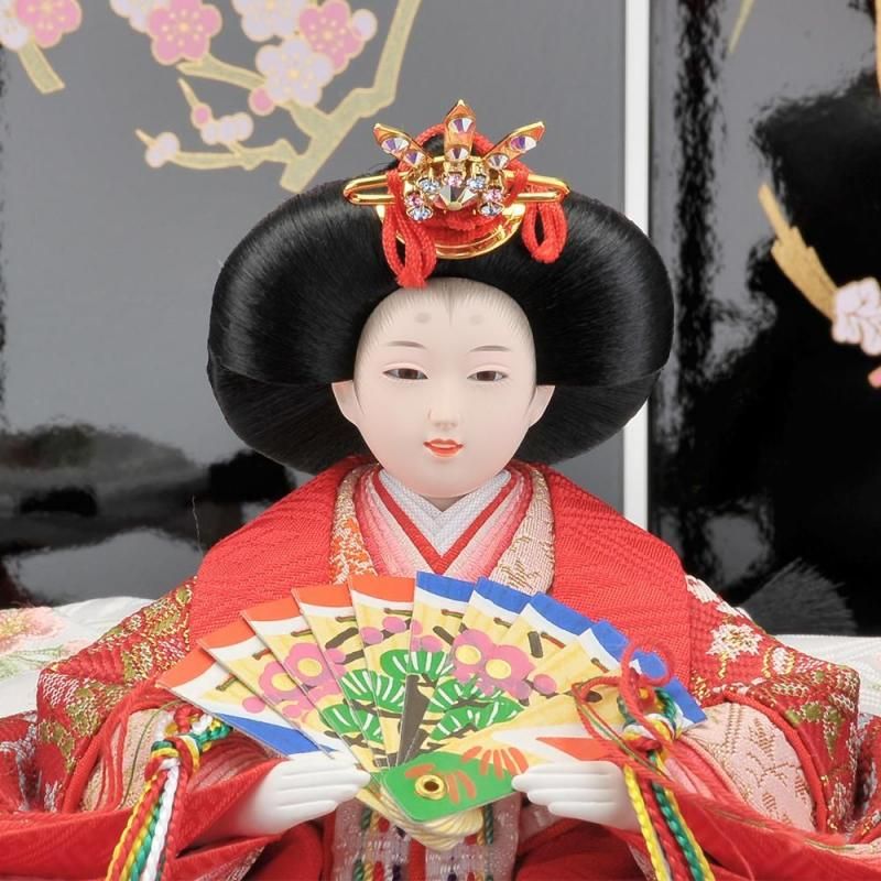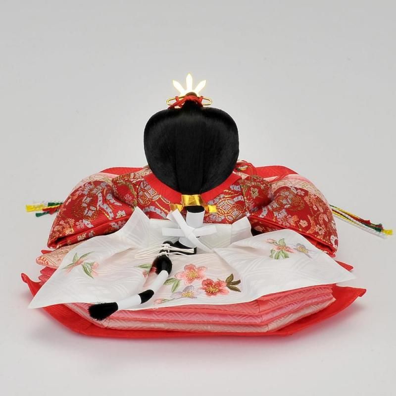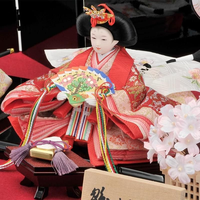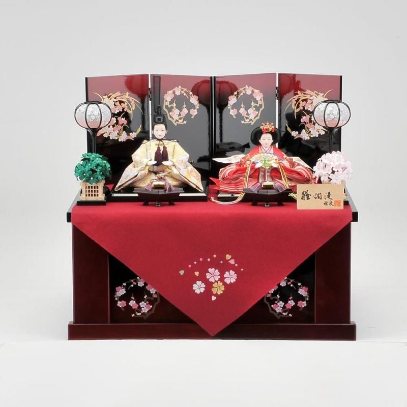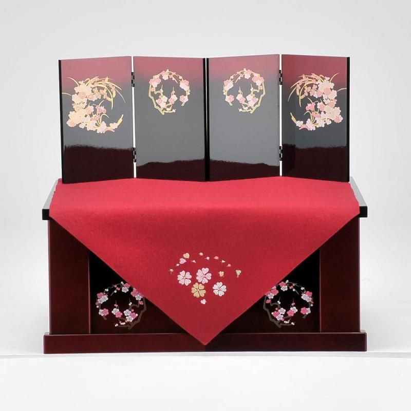 赤い刺繍が付いた毛氈がアクセントになっていて写真のように収納台が半分に分かれ、片づける際も省スペースに収まるおしゃれで可憐なお雛様のセットです。