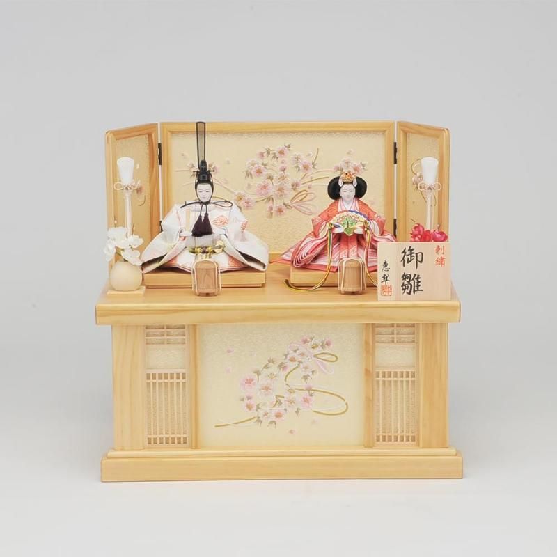 とても小さいサイズの親王飾りですが価値あるセットに仕上がりました。白木の木目を生かした屏風と収納台にはかわいい花柄の刺繍が施されています。写真のようなピンクの名入れ旗をセットすると華やかになります。