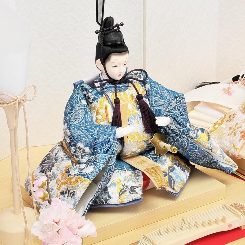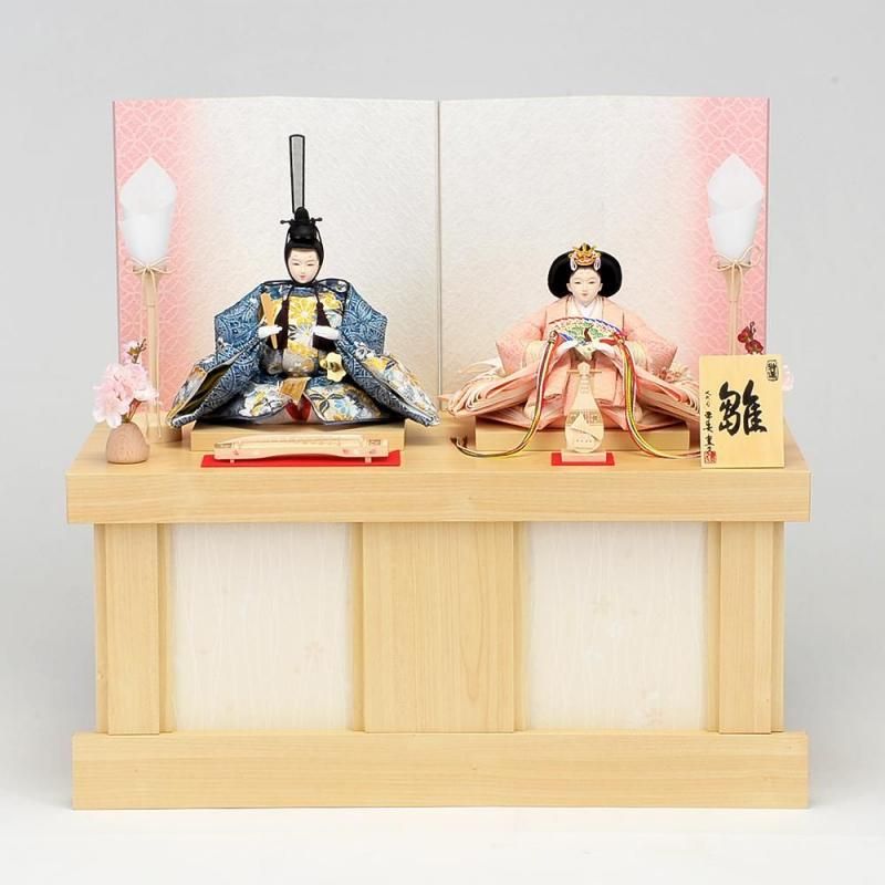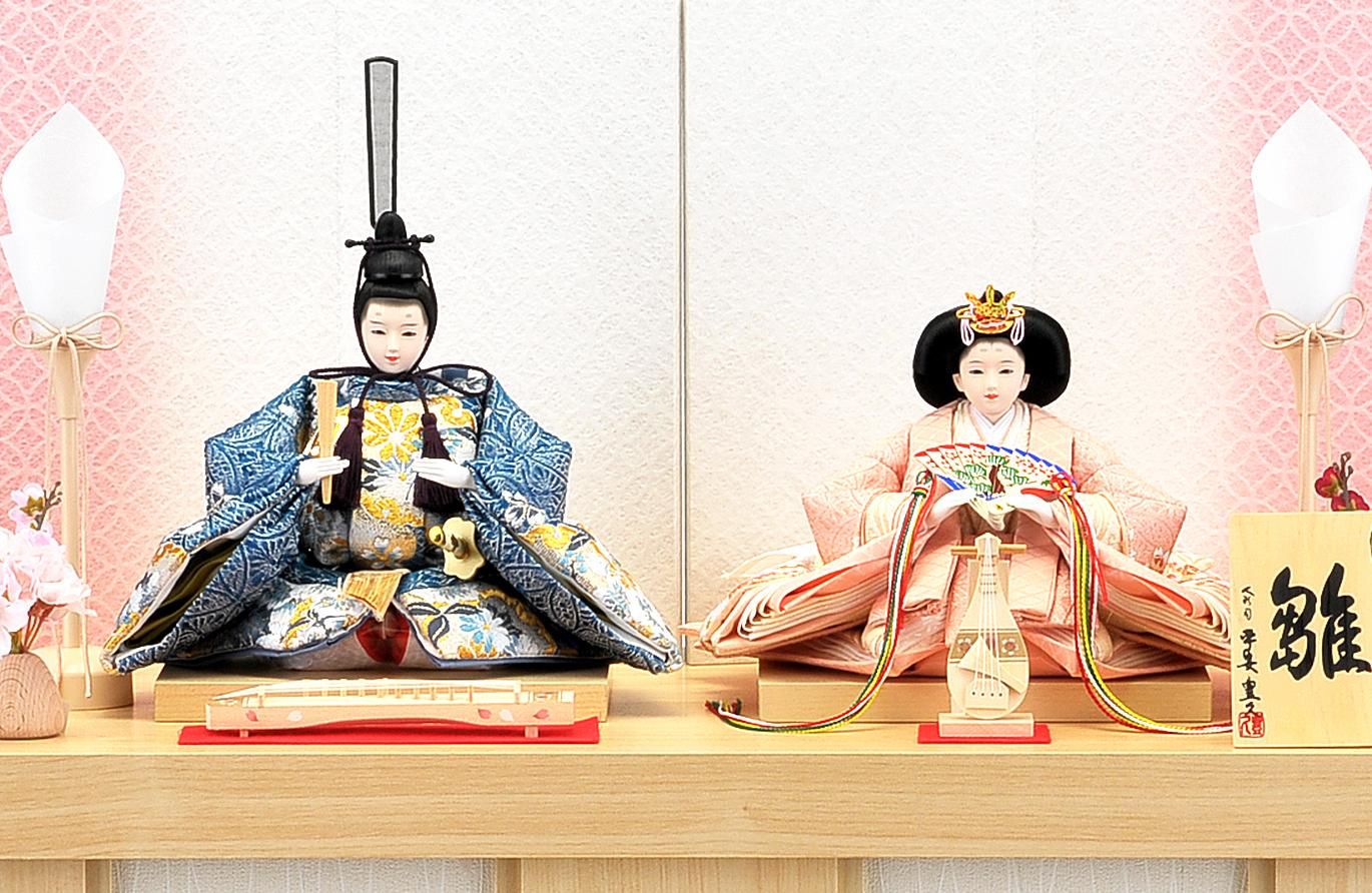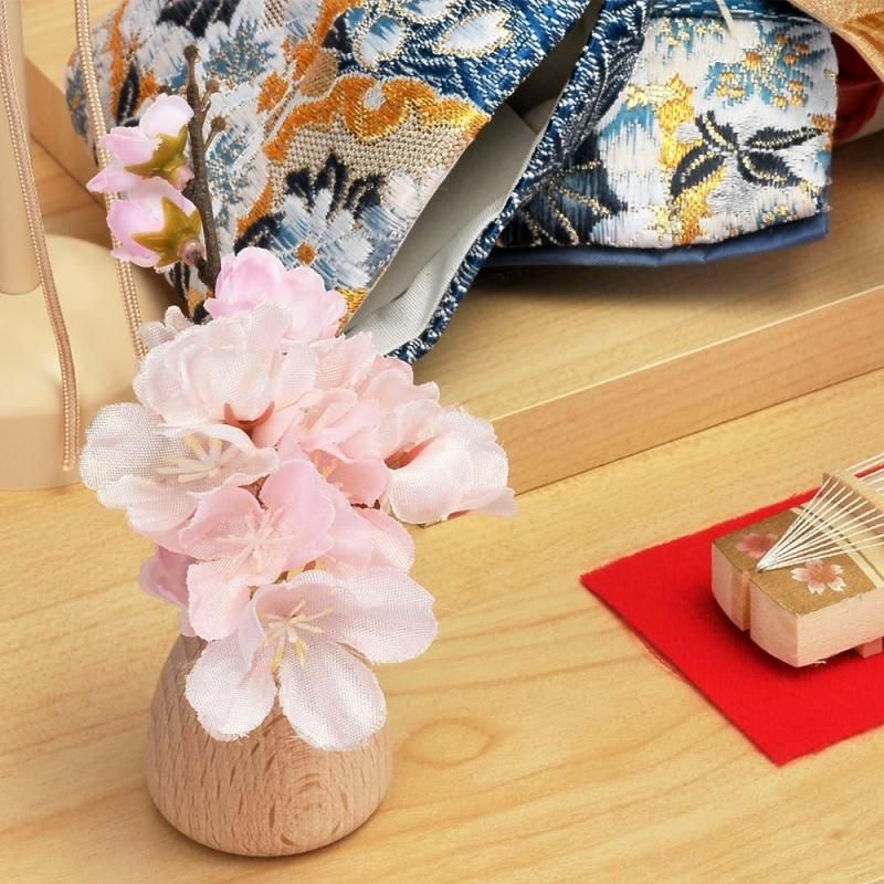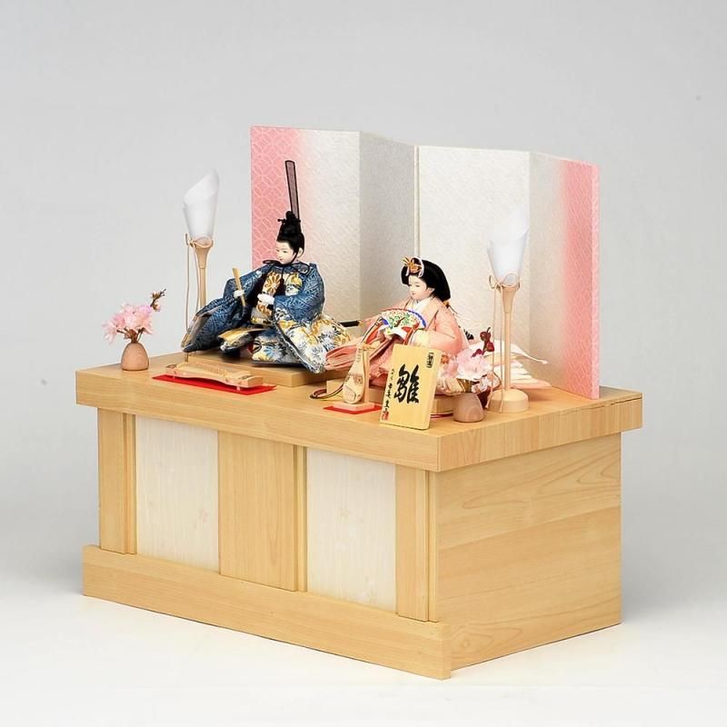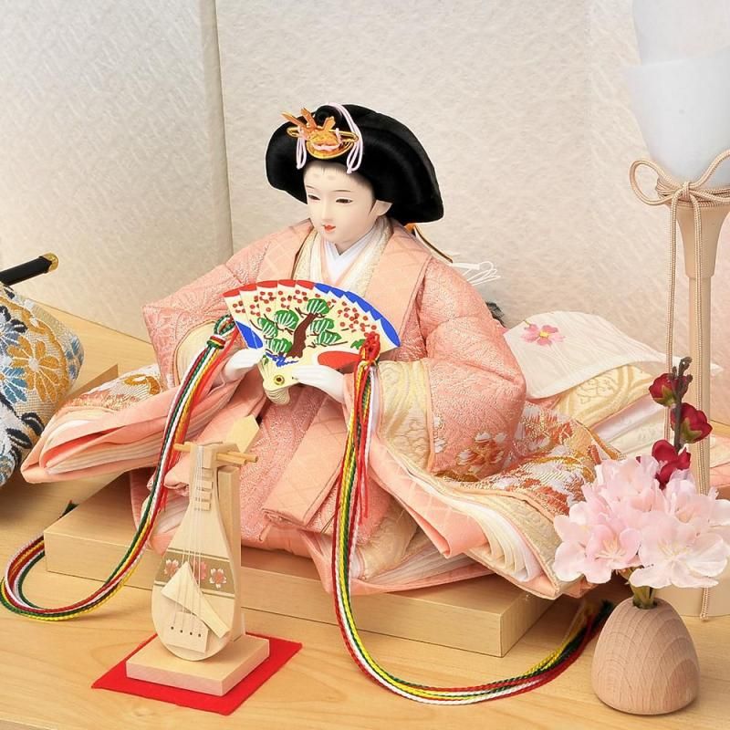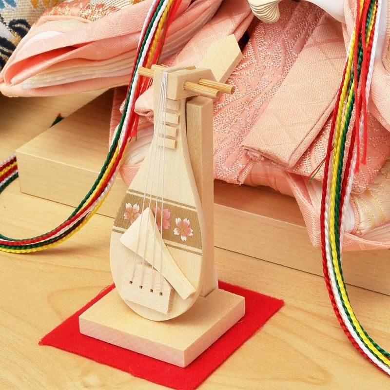 屏風には子孫繁栄を表す吉祥紋の七宝模様が連なり、収納飾り台は木目調の明るい色合いに仕上げました。お道具は白木の琵琶と琴が飾られて楽しい宴を想像させる華やかな装いの親王飾りです。