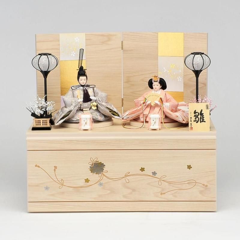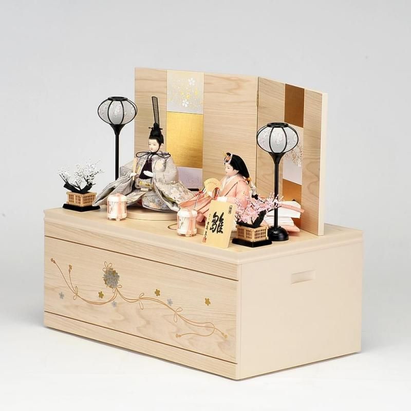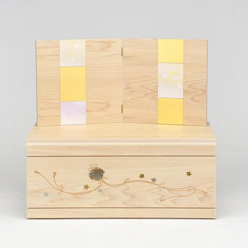 二枚折りの屏風には箔と桜の模様がデザインされ収納箱には花くす玉の蒔絵が施されています。ホワイトカラーでリビングにもぴったりな明るくおしゃれなセットです。