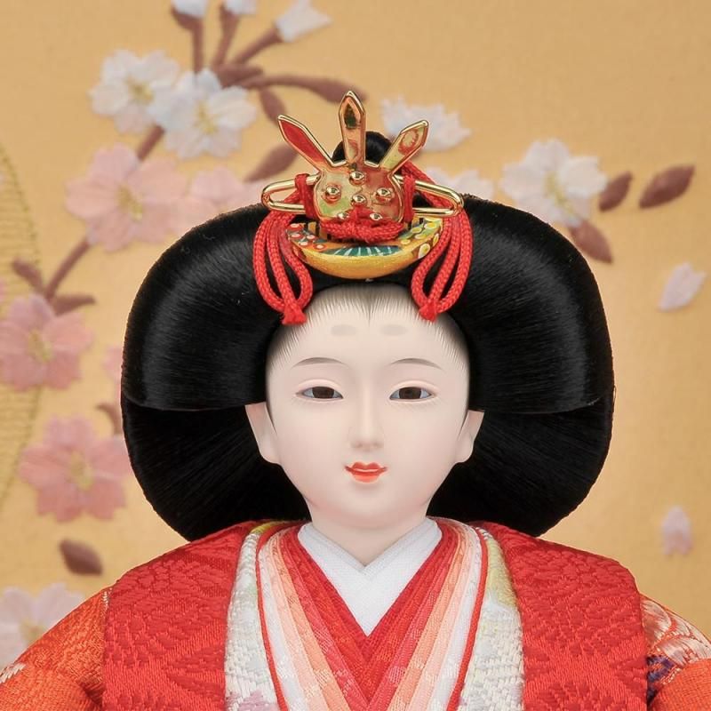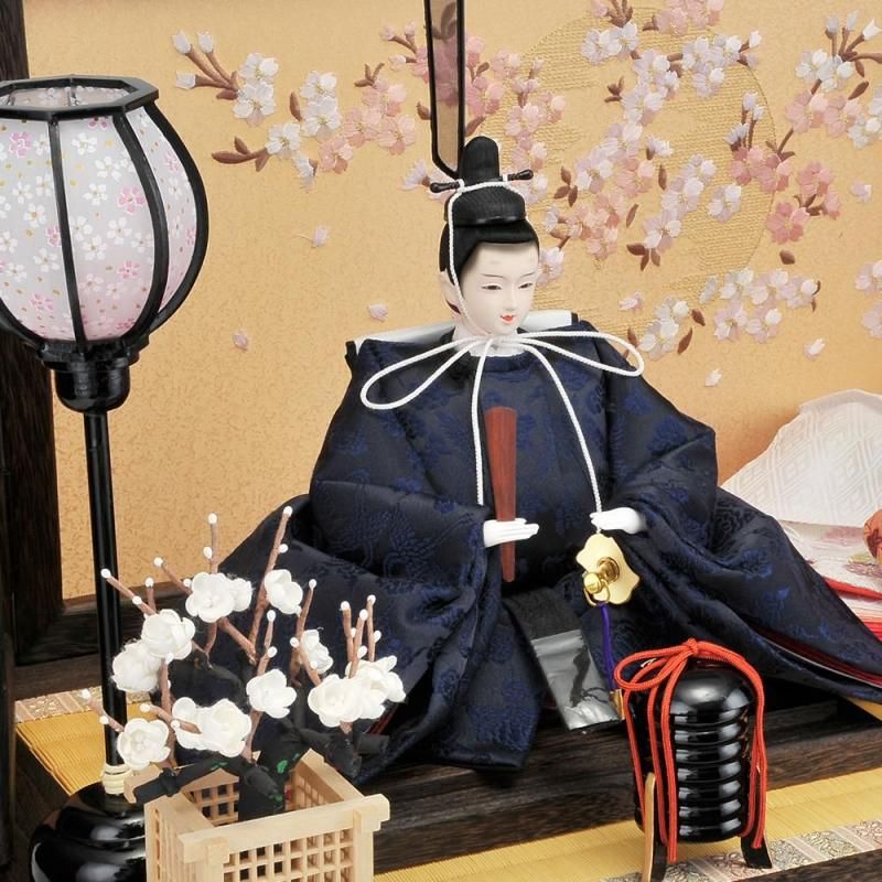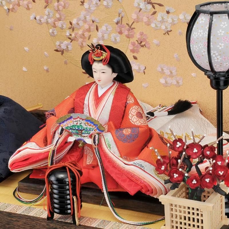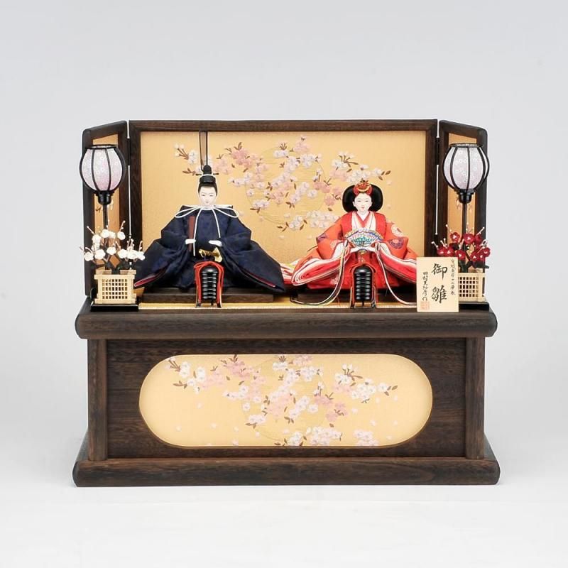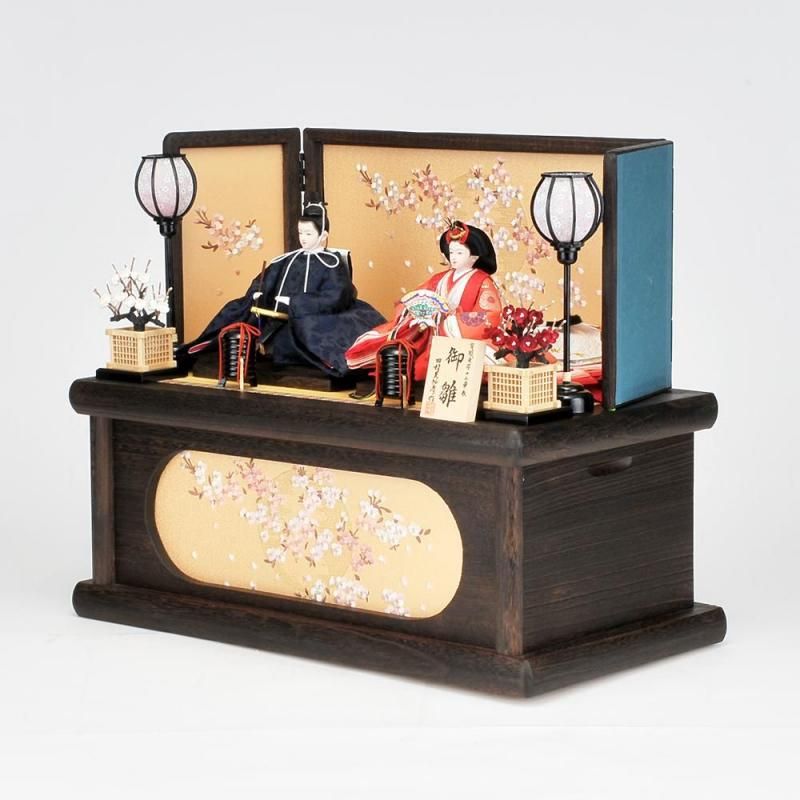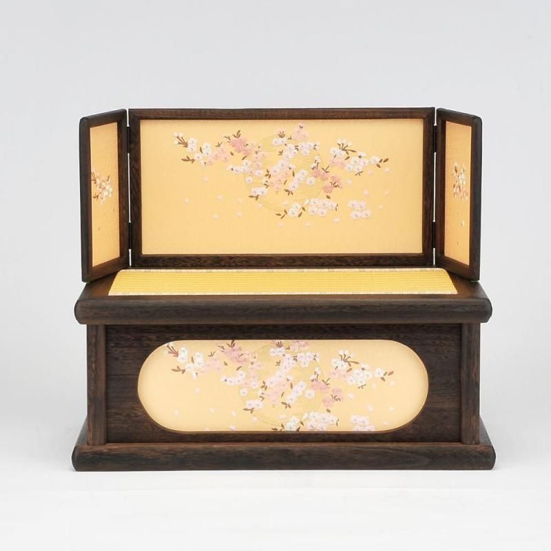 桐の表面に焼き色を付けた焼桐と言われる屏風と収納台をセットし、桜の豪華な刺繍がアクセントになっています。紅白梅の花びらは蚕の繭作られた高級品です。