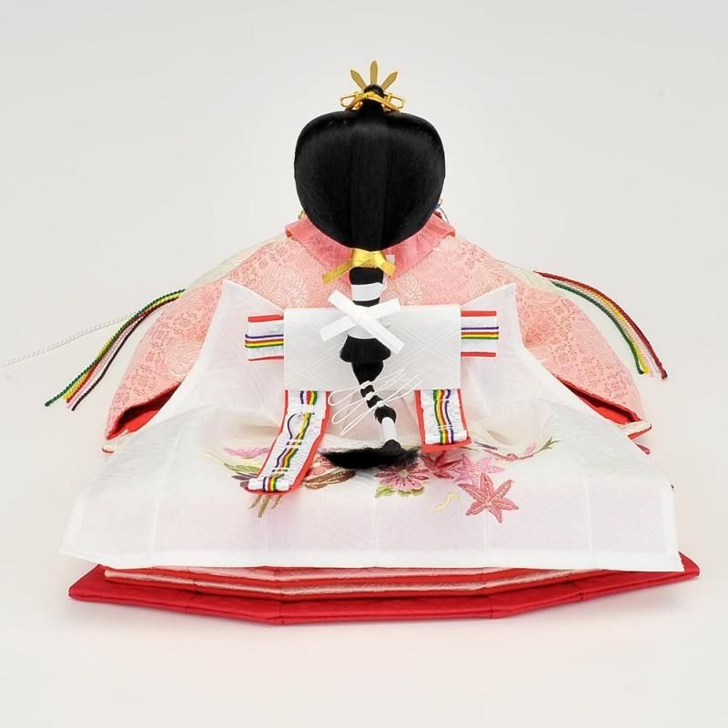 お雛様は古典的な丸文様で明るい白とピンクの色合いが映えます。縮緬素材の紅白梅もかわいくおしゃれです。