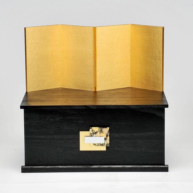 柴田家千代の衣裳は和・洋問わず様々な素材を用いることで有名です。木目を活かした屏風には松葉の蒔絵を、収納台には金銀箔を重ね付けすることで模様を作る引箔という技法を用いた細工が施されています。