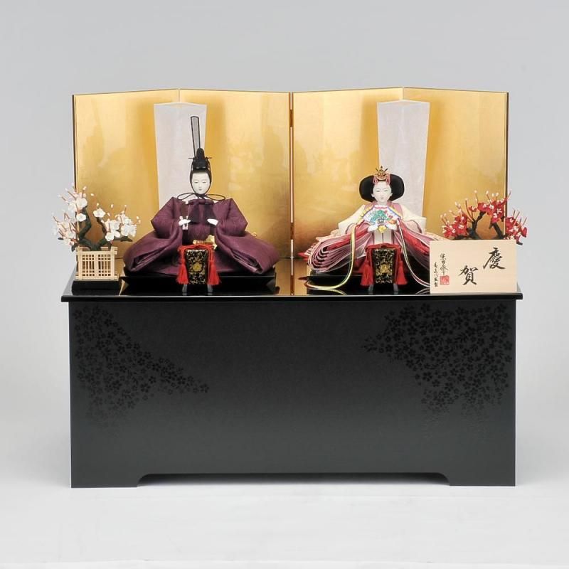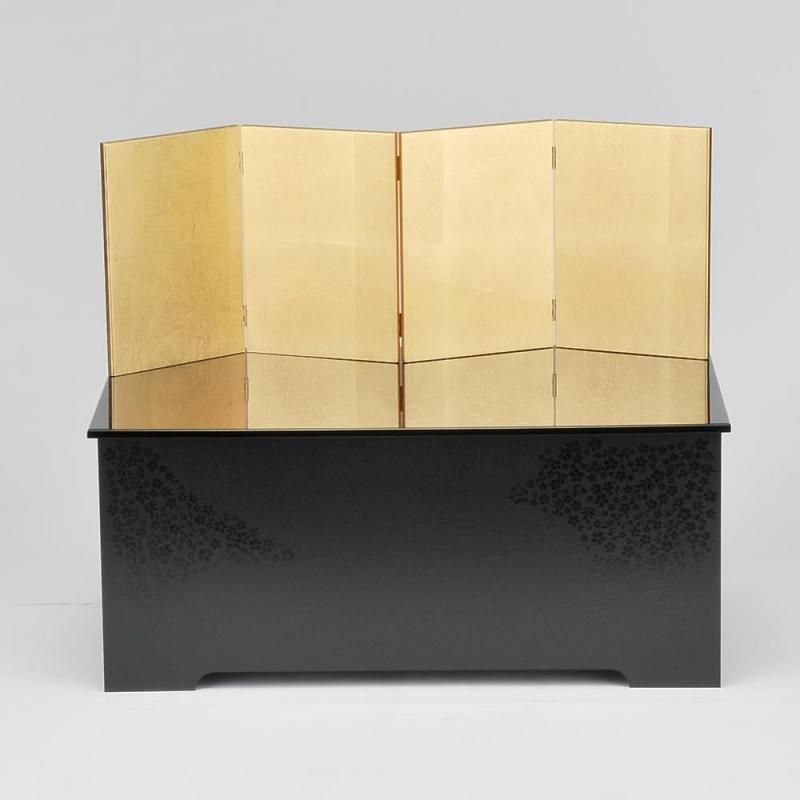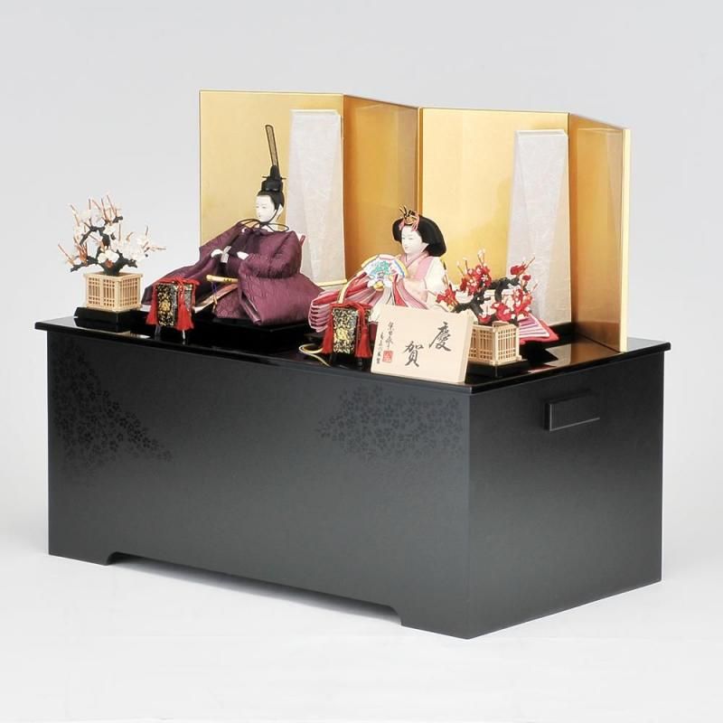 高級会津塗りの収納飾り台にはおしゃれな夜桜の蒔絵が施されています。温かみのある行灯の灯りが上品に映ります。蚕の繭から作られた花びらが特徴の紅白梅がポイントです。