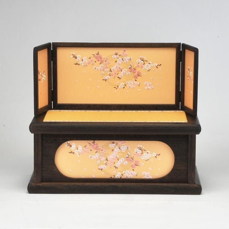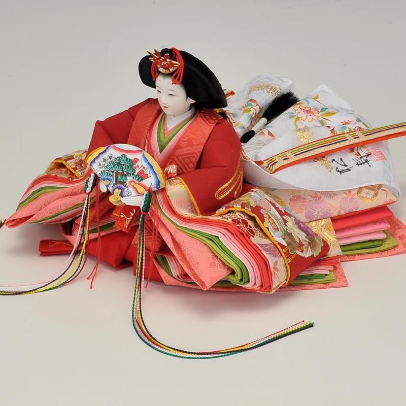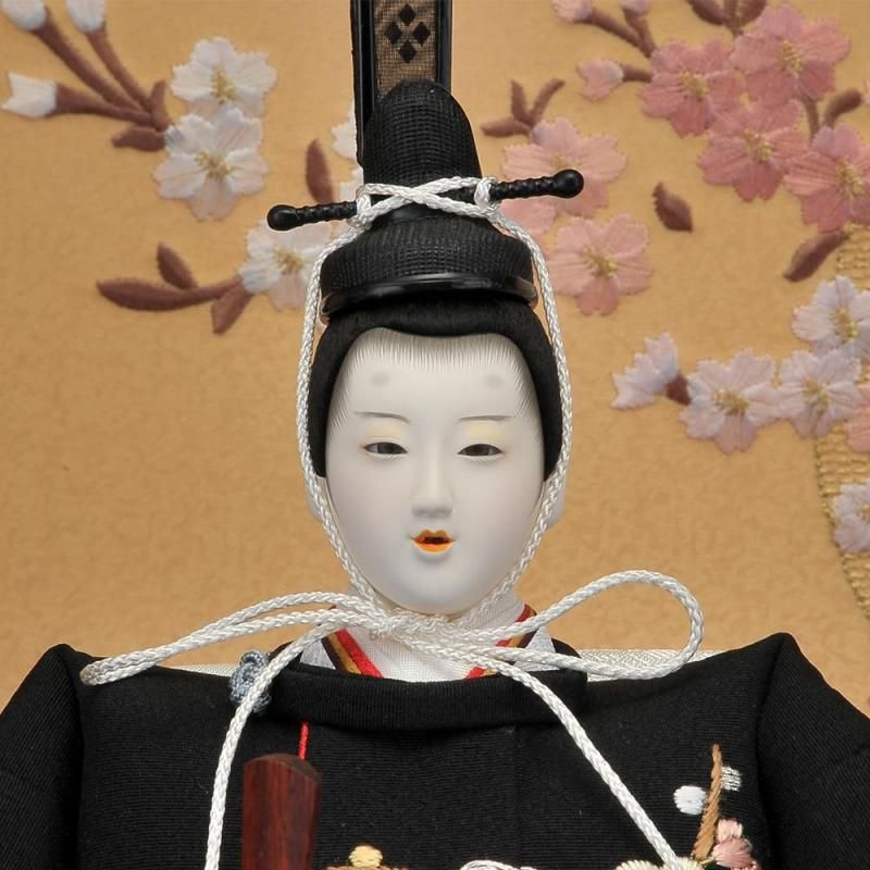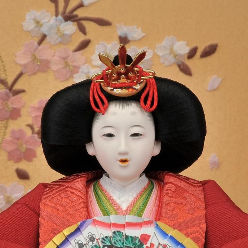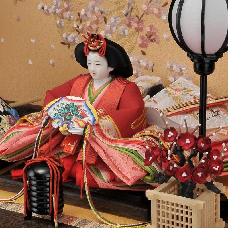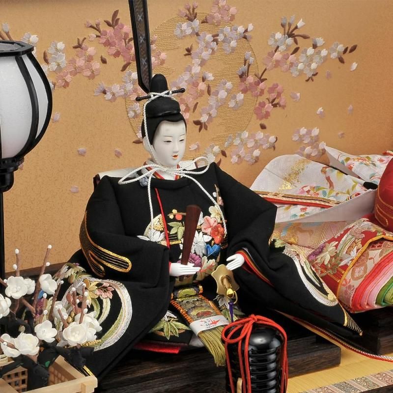 その中でも手刺繍を施した極上仕上げのこのお衣裳は見る者を魅了します。前飾りには唐草模様の蒔絵の貝桶、両サイドには蚕の繭からつくった紅白梅が添えられています。桜の刺繍が綺麗な屏風と収納飾り台がお雛様を優しく包み込んでいます。