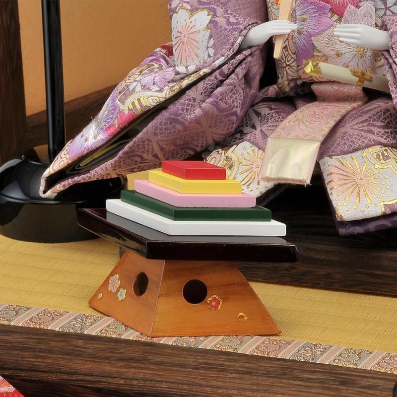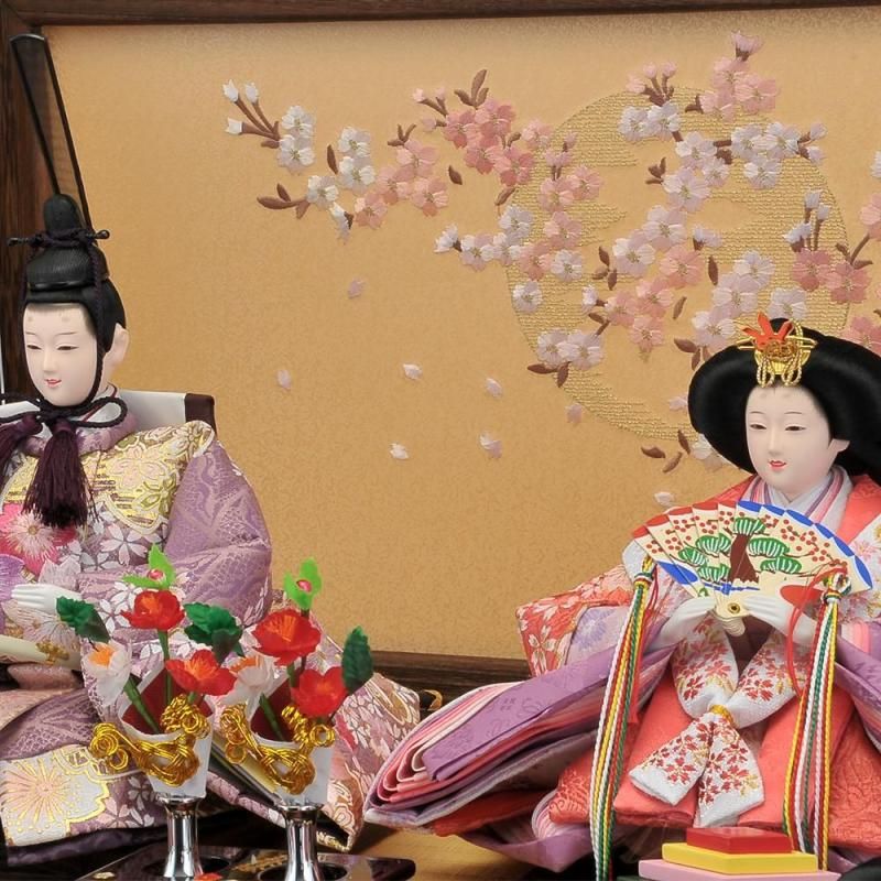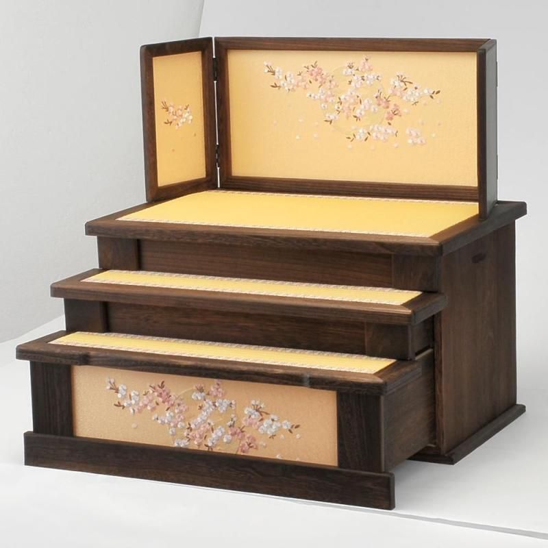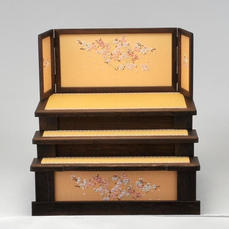 桐は軽くて移動しやすく吸湿性に優れた性質を持ち、お人形を保存するのにピッタリの素材です。夢桜と名付けた屏風と飾り台にデザインされた刺繍が人気です。