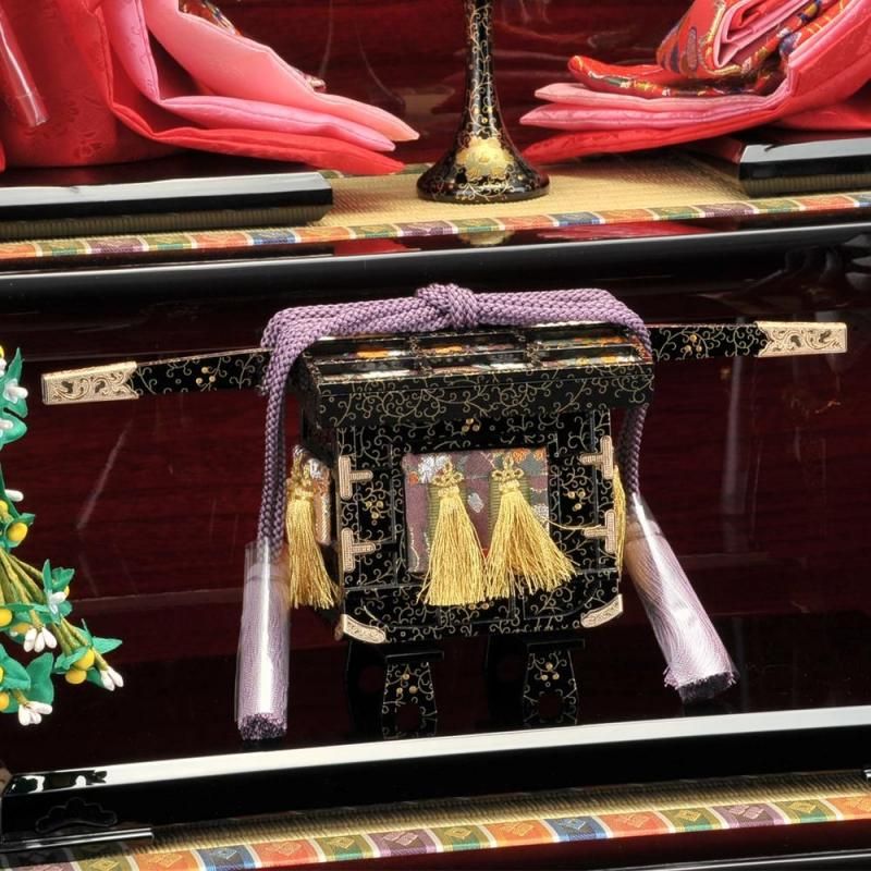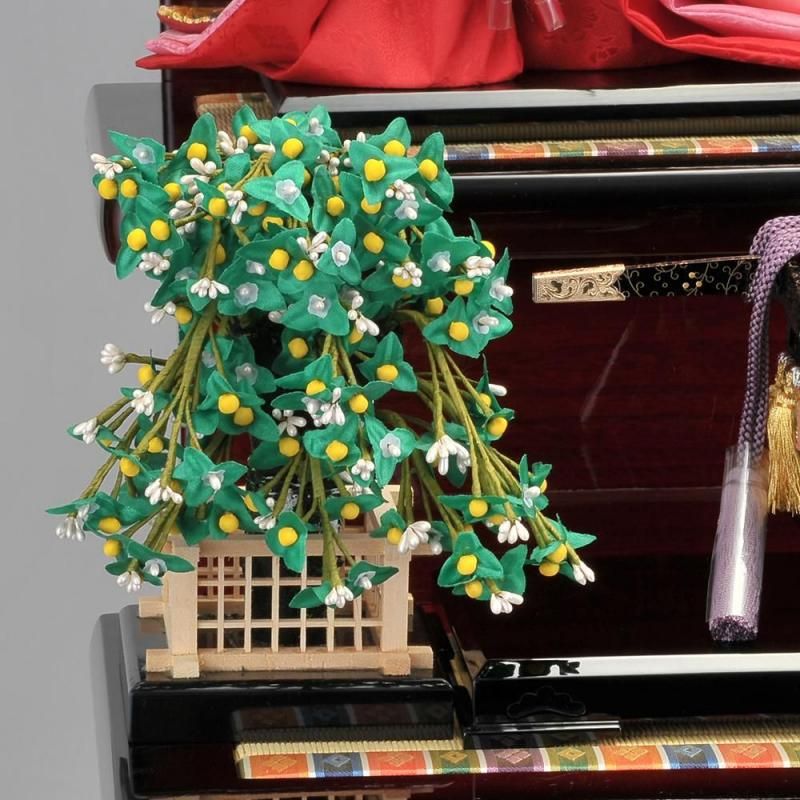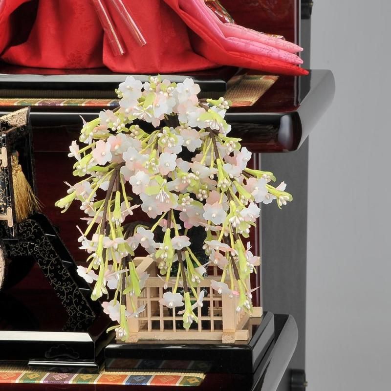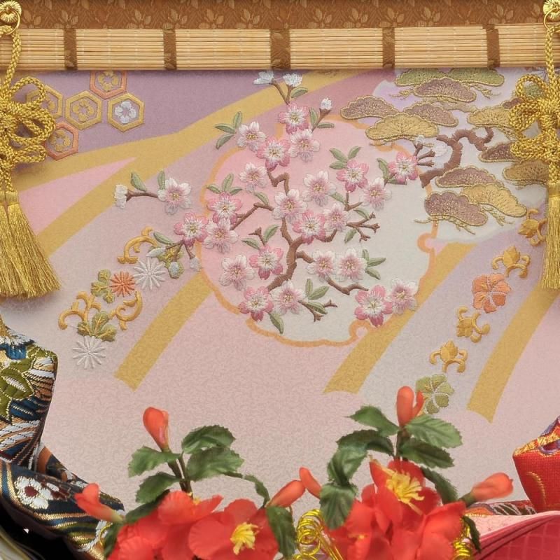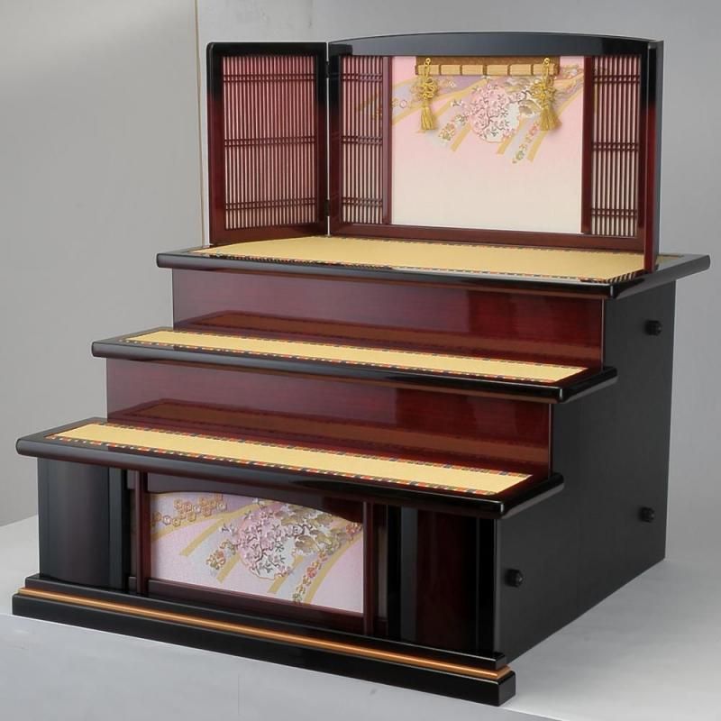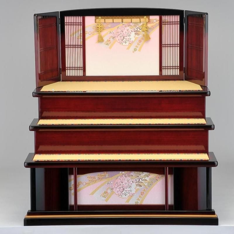落ち着いたダークワイン塗りの屏風と段に厳選した高級金襴を使用し一回り大きく仕上げたお人形をセットしました。