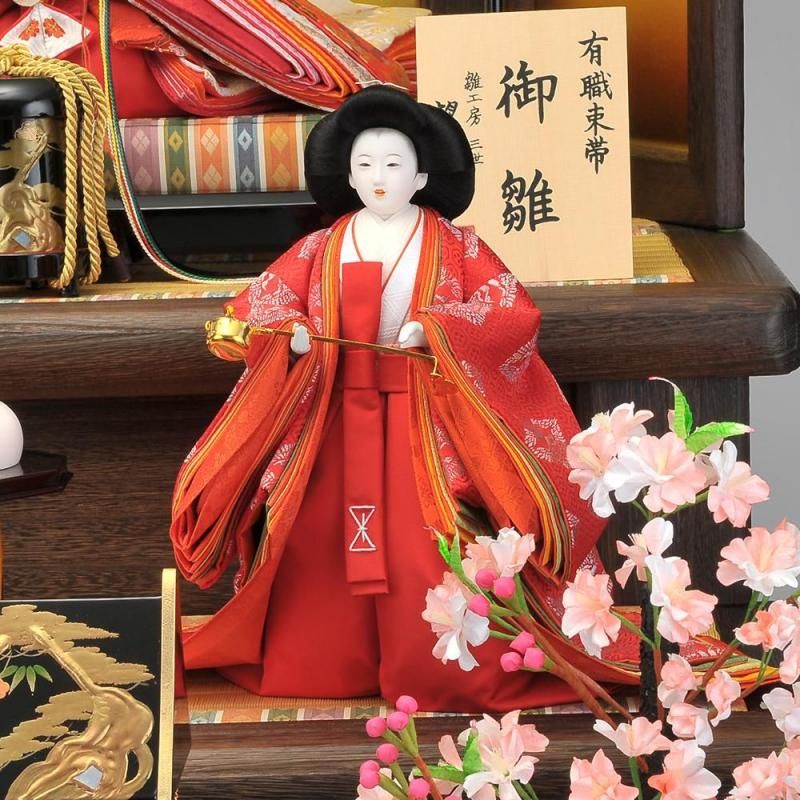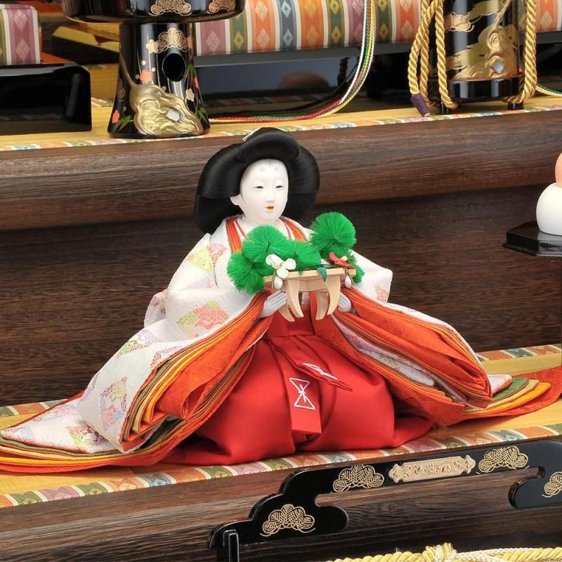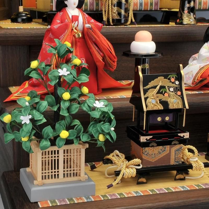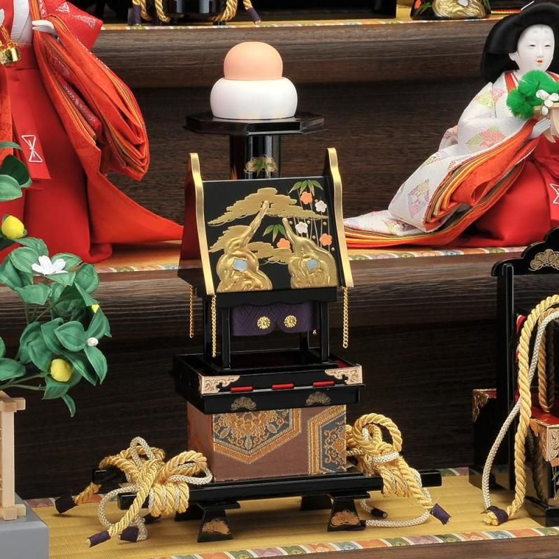 鉾山車風のお道具が豪華な印象を与えます。細部までこだわった職人の心意気が感じられる高級感漂う三段飾りセットです。