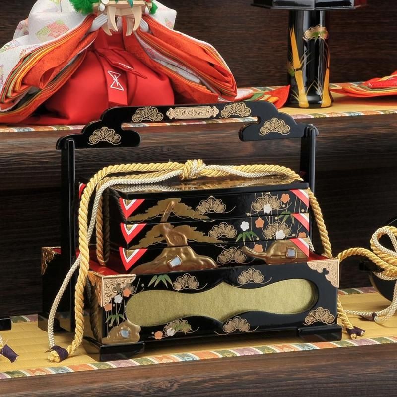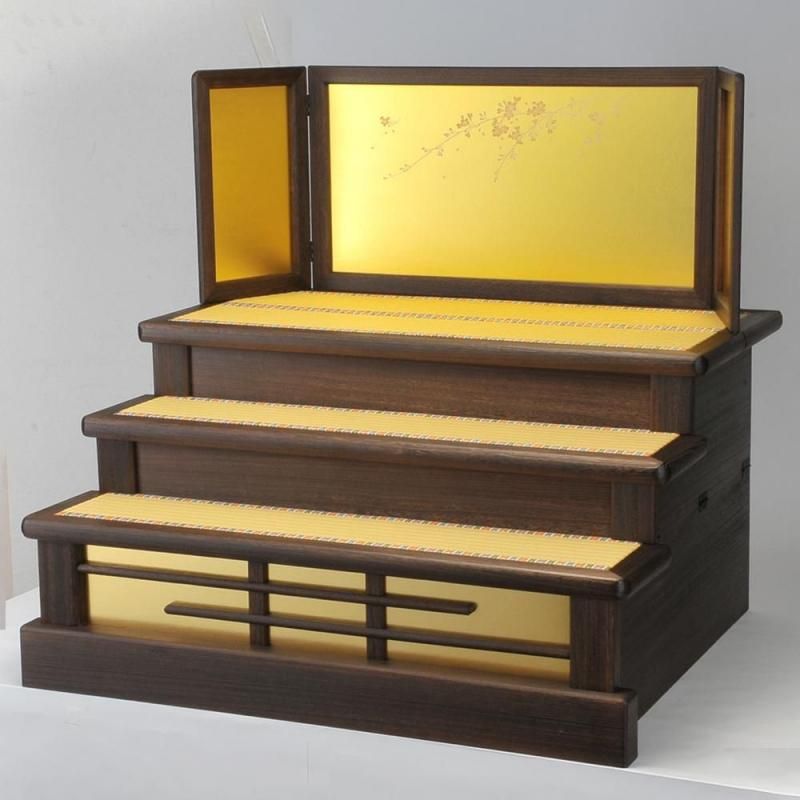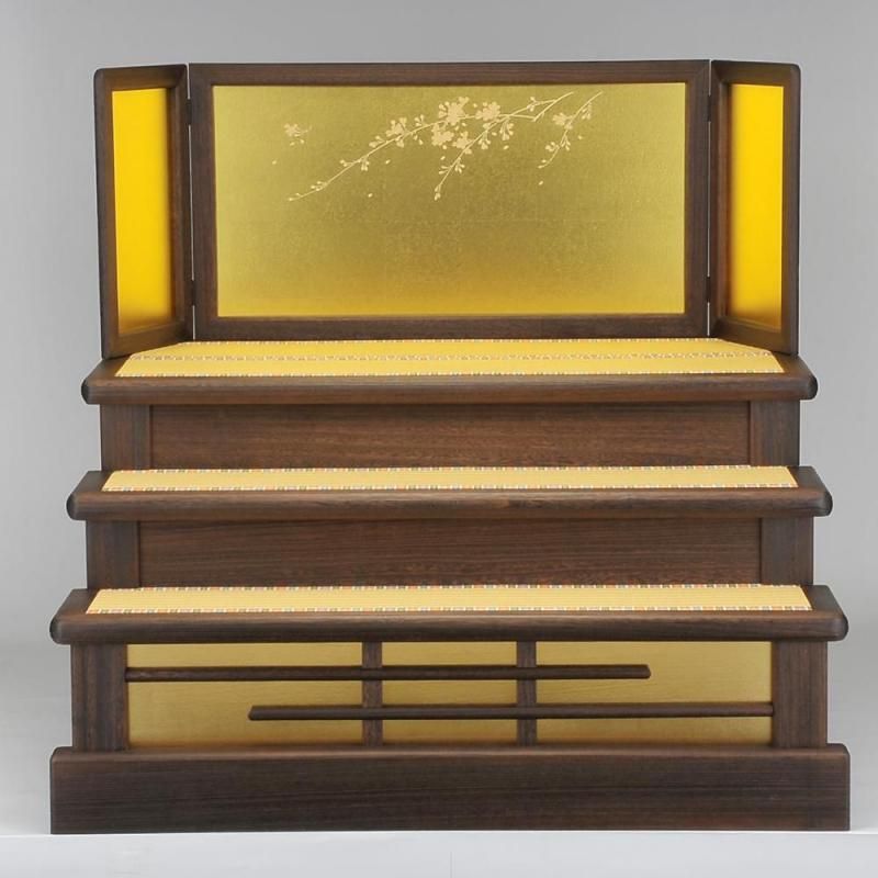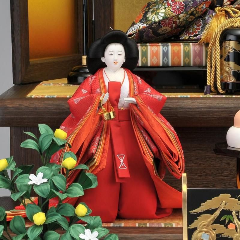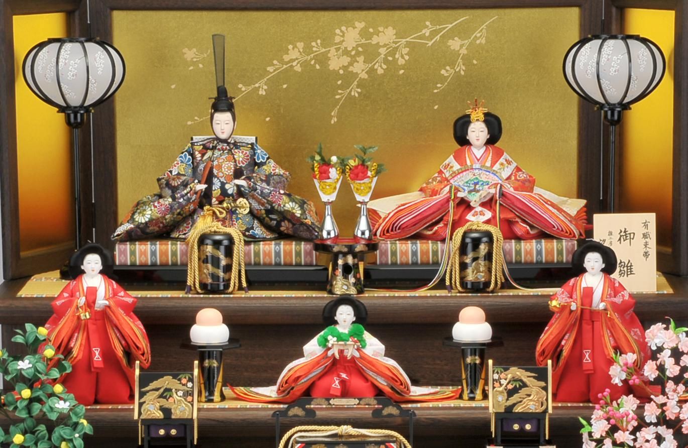 鉾山車風のお道具が豪華な印象を与えます。細部までこだわった職人の心意気が感じられる高級感漂う三段飾りセットです。