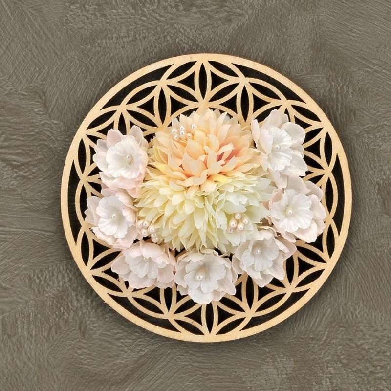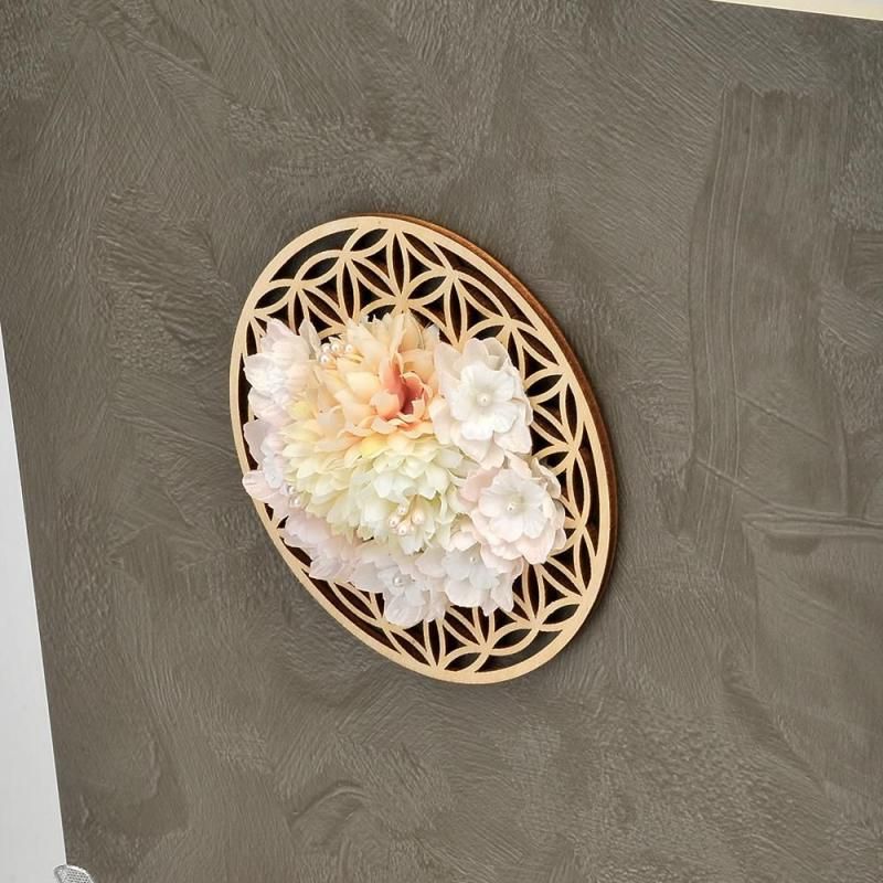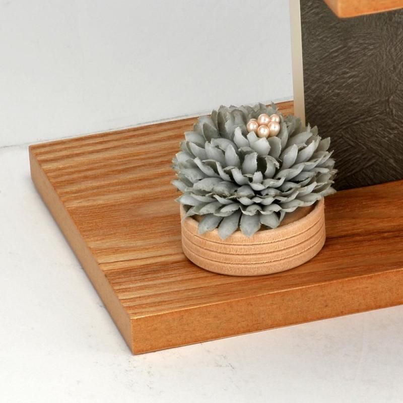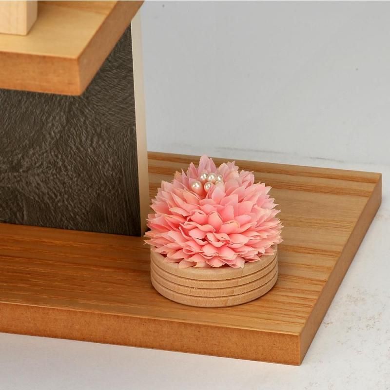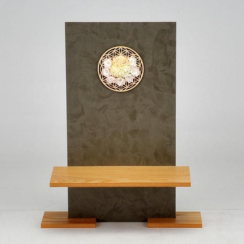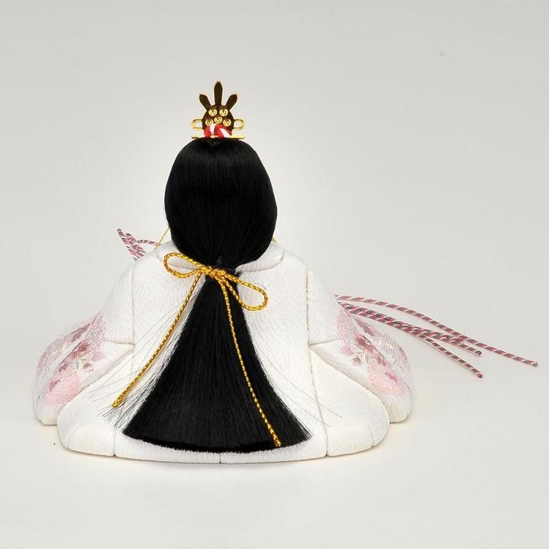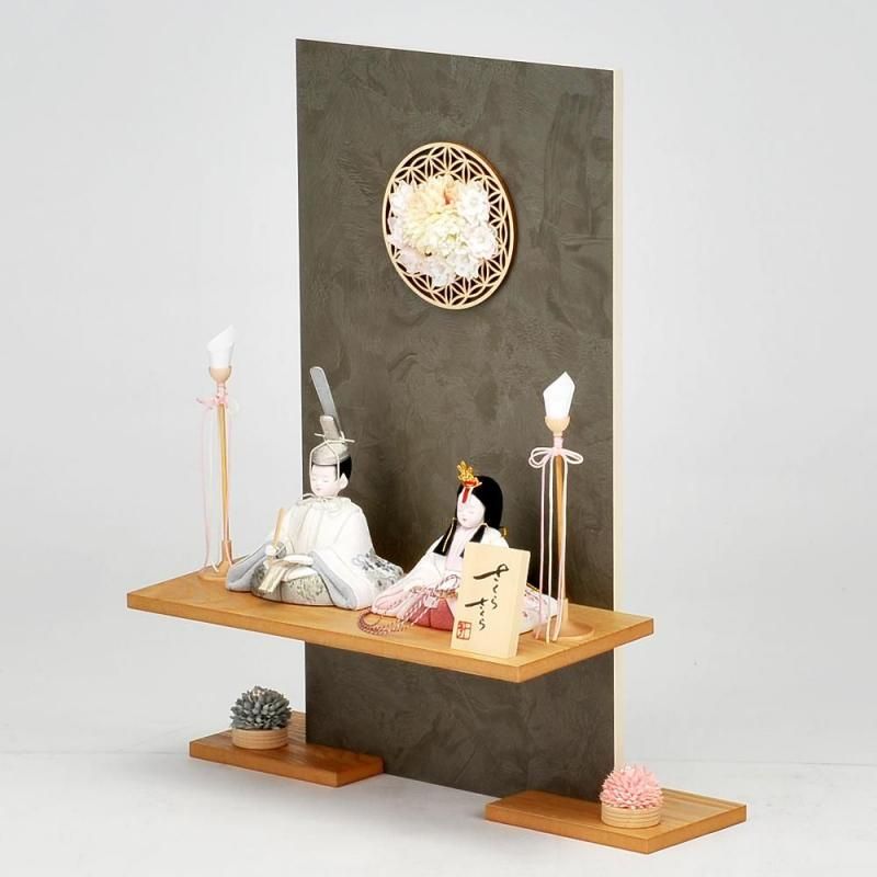 縦長の衝立上部には花飾りが取り付けられています。またお雛様は棚板の上に座っています。奥行きをとらないで飾れるので場所を選びません。